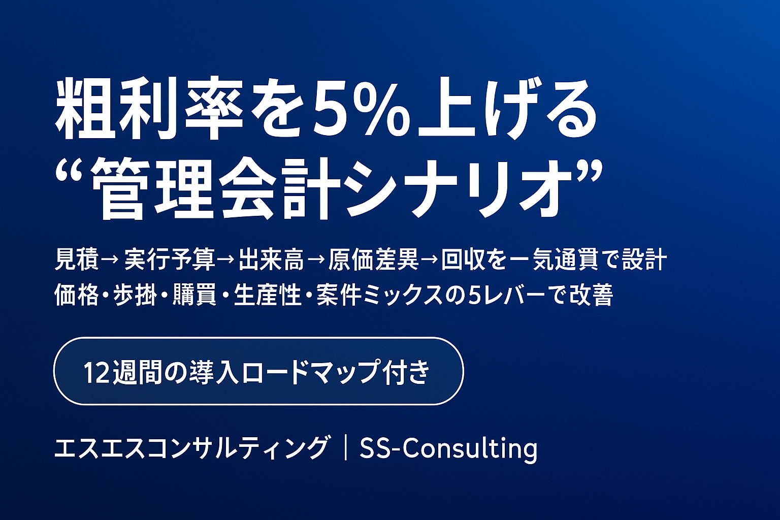 見積・歩掛・購買・出来高・原価差異・回収を一本のシナリオでつなぎ、建設業の粗利率を着実に+5%改善するための実践ガイド。