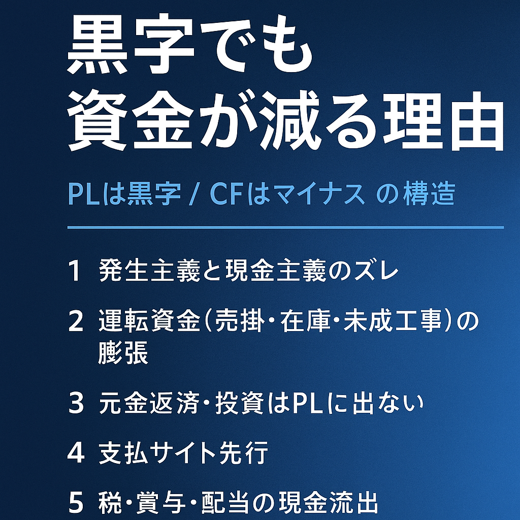 黒字でも資金が減る理由とその構造|発生主義とキャッシュのズレを可視化 { "@context":"https://schema.org", "@type":"Article", "headline":"黒字でも資金が減る理由とその構造", "about":["キャッシュフロー","発生主義","運転資金","管理会計"], "author":{"@type":"Organization","name":"エスエスコンサルティング株式会社"}, "publisher":{"@type":"Organization","name":"エスエスコンサルティング株式会社"}, "inLanguage":"ja" }