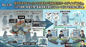 No.134 【共感】会社が大きくなり、リスク管理や税金対策、将来の承継をどうするか悩んでいる。【解決策】持株会社を設立し、事業ごとに会社を分けるメリット(リスク遮断、税制優遇、後継者への株移転など)と、導入タイミングの解説。