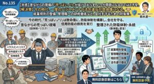 No.135 【共感】昔ながらの現場の「荒っぽいノリ」が抜けておらず、いつか問題になるのではと不安。【解決策】今の時代、一度のハラスメントや法令違反が致命傷になる。就業規則の整備、管理職への研修徹底など、会社を守るための防衛策。