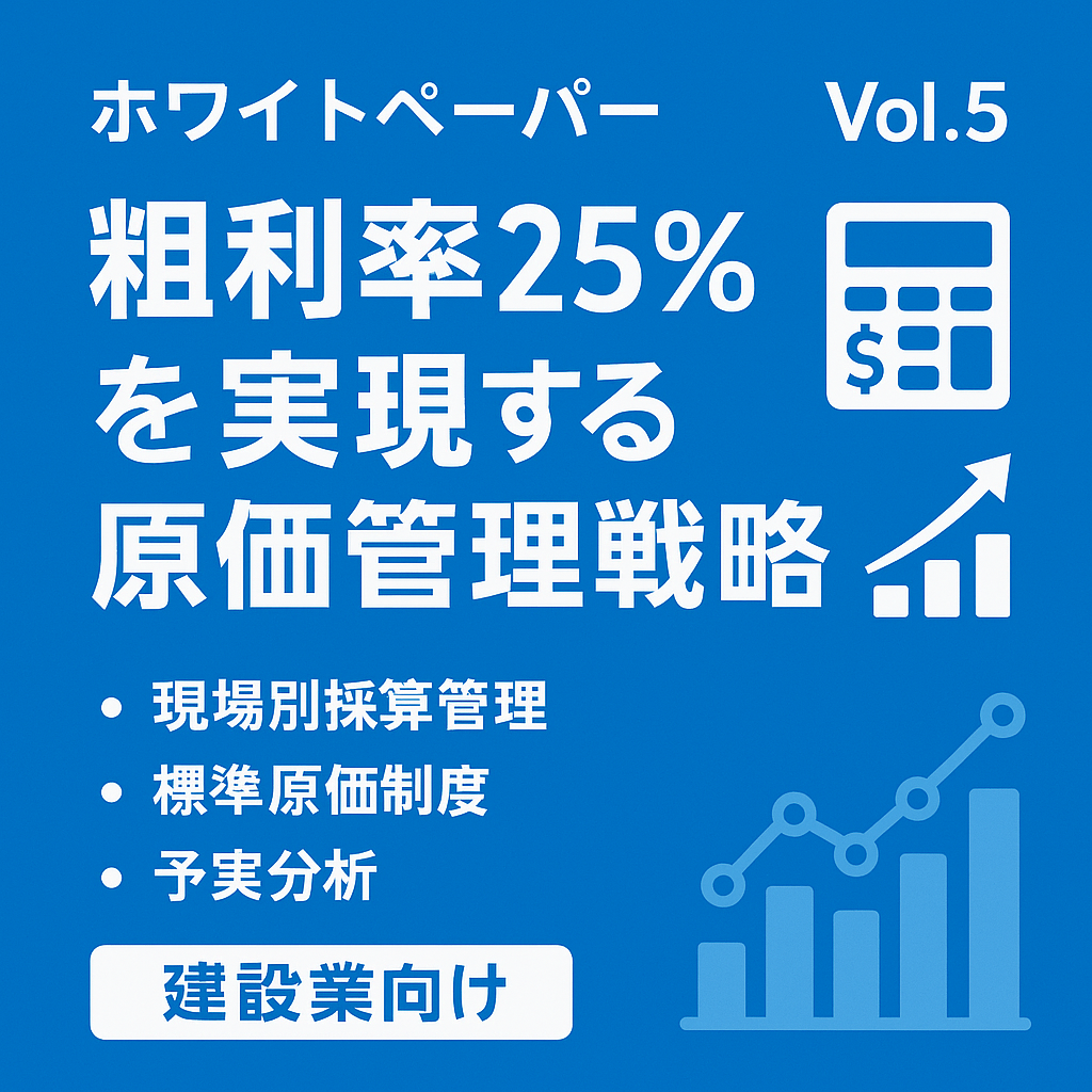 建設業で利益を左右するのは「原価管理」。 本ホワイトペーパーでは、粗利率25%を実現した実践的な原価管理戦略を、 現場別採算・標準原価制度・予実分析の3ステップで体系的に解説します。