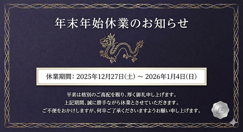 年末年始の業務につきまして、下記の通りご案内申し上げます。