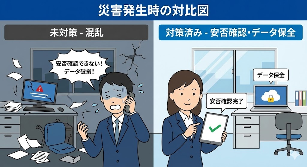しかし、東日本大震災や各地の豪雨災害を見て明らかなように、想定外は必ず起こります。その時、社員の安否が確認できず、重要データが消失し、資材が届かなければ、会社は機能不全に陥ります。それは、顧客からの信用失墜、ひいては倒産に直結する致命的なリスクなのです。