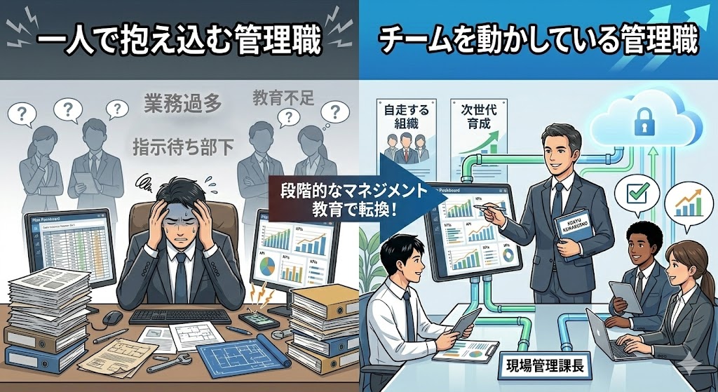プレイヤー思考が抜けない管理職は、常に自分が現場の最前線に立ち続け、結果として業務過多でパンクします。一方で部下は「どうせ課長がやってくれる」と指示待ちになり、一向に育ちません。これが、現場力も管理能力も中途半端になってしまう最大の理由です。